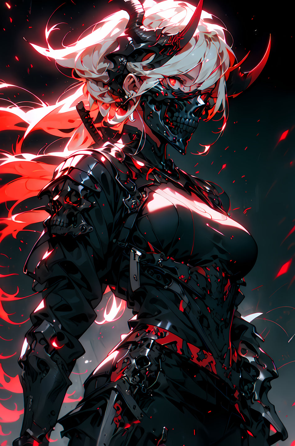 Her face is concealed by a fearsome facemask, evoking the visage of a skull and shrouding her expressions in an enigmatic aura. Radiant red eyes emanate an intense glow, reflecting her inner fire and the passion that fuels her every move.