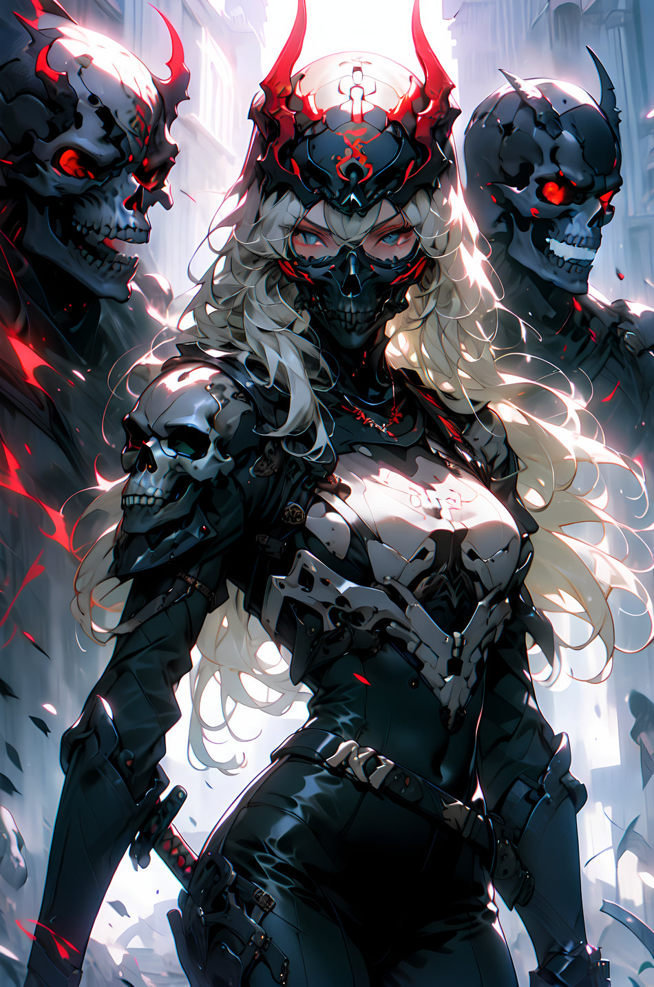 Nova, known as "Boneforge," is a commanding and formidable warrior who stands at the helm of a futuristic skeletal army. Her armor, a harmonious blend of white, black, and red, symbolizes both her authority and her prowess on the battlefield. Each plated piece hugs her form, a visual testament to her strength and capability.